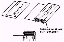 back twice, thus turning the cut edge inside the second fold to prevent fraying and to reinforce the hem. The hem may also include a piece of reinforcing tape, plain or tubular webbing for adding strength. All seams