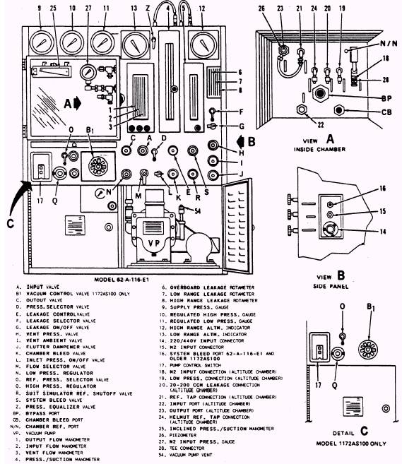 Figure 11-1.-Controls and indicators for Oxygen System Components Test Stand Model 117AS100. (See figure 11-2.) Baffles inside the element create a flow restriction. As air or nitrogen enters the element, a pressure buildup is created at the inlet end; as it flows past the baffles, a pressure drop occurs at the outlet end. The inlet (pressure buildup) tap is connected to the bottom of the indicating manometer, and the outlet (pressure drop) tap is connected to the top of the manometer. As the control valve is opened, gas flows from the valve through the Vol-O-Flo, and the pressure drop thus created allows the fluid in the manometer to rise. The operator reads the amount of flow passing through the V0l-O-Flo on the indicating manometer. CONTROL VALVES A control valve regulates, or restricts, a specified flow. Two types of control valves, measuring and nonmeasuring, are used on the test stand. Measuring control valves have measuring devices (gauges or manometers) to visually measure the flow through the valve as it is opened. Nonmeasuring control valves have no indicating devices. There are six measuring and three nonmeasuring control valves on the test stand. Measuring Control Valves The measuring control valves (fig. 1 l-l) are as follows: 1. The INPUT valve (A) allows a measurable flow of air into the altitude chamber. It can only be used during simulated altitude conditions. As the chamber altitude increases, pressure inside the chamber decreases, and the ambient air pressure outside the chamber is greater. When valve (A) is opened, air from outside the chamber flows through valve (A); through the input Vol-O-Flo element, indicating the amount of air flow on the INPUT FLOW manometer (2); and through the INPUT port (22) into the chamber. 2. The VACUUM CONTROL valve (B1) on Model 1172AS100 allows direct evacuation of the altitude chamber to the desired simulated altitude by decreasing pressure in this chamber. 3. The OUTPUT valve (C), when opened, draws a direct flow from the item under test through the piezometer (26), OUTPUT port (23), FLOW SELECTOR valve (M) and the output Vol-O-Flo element to the vacuum pump. As the flow passes through the output Vol-O-Flo, the pressure is displayed on the OUTPUT FLOW manometer (1). 4. The LEAKAGE CONTROL valve (E) controls the flow to the LOW-PRESSURE connection (19), which is located inside the chamber. As the name of the valve implies, it is used to perform various leak tests on oxygen components. When you use the LEAKAGE CONTROL valve (E) to perform leakage tests on components, a line with bayonet fittings must be installed between the LOW-PRESSURE connection (19) and the REFERENCE-TAP connection (21 ). This allows the flow passing