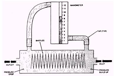 Figure 11-2.-VOI-O-FIO element. through valve (E) to be indicated on PRES-SURE/SUCTION manometer (4) or Hg manometer (5), whichever you have selected. Any leakage would be registered on rotameters (7) or (8). 5. The VENT PRESSURE valve (H) controls a vent flow of low pressure through the suit simulator tank to the item under test at sea level. When valve (H) is opened, nitrogen (N2) flows through the vent flow Vol-O-Flo element, and is indicated on VENT FLOW manometer (3). The flow then passes to the suit simulator tank, through FLOW SELECTOR valve (M), OUT-PUT connection (23) and piezometer (26) to the item under test. Valve (H) is primarily used for testing relief valves. 6. The VENT AMBIENT valve (I) serves the same purpose as VENT PRESSURE valve (H), except that valve (H) is used at sea level with supply pressure, while valve (I) is used at altitude and uses ambient air as the pressure source to conserve N2. Therefore, valve (I) can be considered an economizer valve, used only "at altitude."