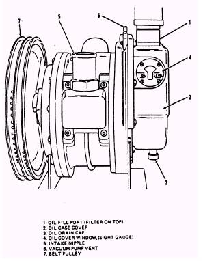 Figure 11-3.-Vacuum pump. PUMP vent (54) must be opened one to two turns when you operate the pump (fig. 11-1). WARNING ALWAYS ENSURE THAT THE PUMP MOTOR HAS A FOUR-PRONG ELEC-TRICAL CONNECTION PLUG. ON MODEL 1172AS100 ENSURE THAT THE GROUNDING LUG IS IN PLACE AND SECURELY CONNECTED. A SIDE VIEW OF THE VACUUM PUMP IS SHOWN IN FIGURE 11-3. SAFETY PRECAUTIONS Before you attempt to operate the test stand, review the following safety precautions. These safety precautions must be observed before, during, and after test stand operation. 1. Ensure that the test stand is properly secured prior to opening the supply cylinder valve. Position the HIGH PRESSURE REGULATOR to LOAD, then to VENT, and ensure that the LOW PRESSURE REGULATOR is backed out and the other valves are turned fully to the right. 2. Keep the chamber door closed whenever possible. 3. Keep the test stand doors closed at all times. 4. Keep the test stand work tray closed when it is not in use. 5. Check the pump lubricant prior to turning the pump on (run for 2 minutes and check lubricant for proper level). 6. Keep your hands and head clear of belts and pulleys while checking the lubricant level. 7. Ensure the test stand is properly grounded by using the grounding lug. 8. Never use regulated high pressure and regulated low pressure together. 9. When the oxygen monitor alarm sounds, leave the room. 10. Do not panic when the test stand malfunctions. 11. When you use nitrogen, ensure that the room is well ventilated. 12. Use proper tools for the job you are performing. 13. Do not inhale lubricant, oxygen cleaning compound, or mercury fumes. 14. Wash pump lubricant or mercury from hands immediately. 15. Secure the test stand completely after use. 16. Never leave the test stand unattended while the pump is running. 17. When transporting the compressed nitrogen cylinder, you should ensure the protective cap is on. MAINTENANCE Maintenance on the oxygen components test stand is discussed in the following paragraphs. |