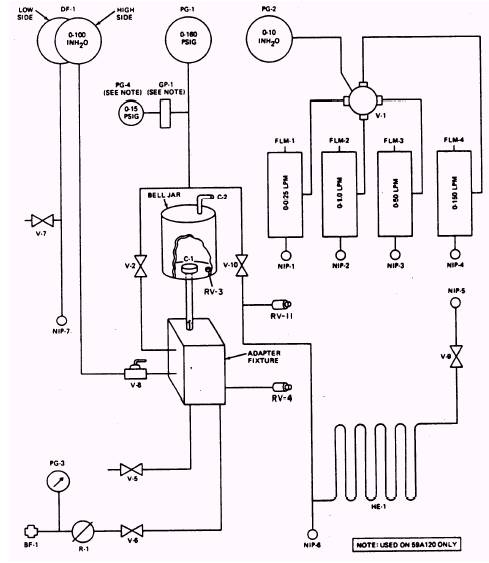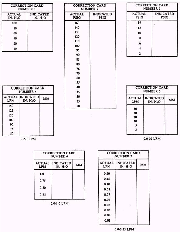 Figure 11-5.-Test stand schematic. 11-15 converter supply flow control valve V-9 controls the flow of oxygen from the liquid oxygen converter through the heat exchanger HE-1 to the buildup and flow valve V-10, and then to the adapter fixture. There are four linear flow elements. Each measures a different flow rate in liters per minute (LPM). By using a hose assembly connected from NIP-5 (converter supply outlet connection) to the correct one of the linear flow elements (NIP-1 for 0-00.25 LPM, NIP-2 for 0-1.0 LPM, NIP-3 for 0-50 LPM, or NIP-4 for 0-150 LPM), and turning the flowmeter selector valve, you can measure leakage from an item under test. Liquid Oxygen Quantity Gauge Capacitor-Type Tester The liquid oxygen quantity gauge capacitortype tester is located on the upper front panel of the test stand and operates on 115 Vat, 400-cycle current. It is used to measure capacitance and electrical insulation of the capacitance probe. Flow of Oxygen As you turn on the supply of gas, it flows into the test stand through a special bulkhead fitting BF-1 (fig. 11-4), and it is indicated on the 0-3,000 psig pressure gauge PG-3. It then flows to the adjustable pressure regulator R-1. The regulator is preset to deliver 160 psig to the remainder of the test stand through oxygen supply valve V-6. Oxygen supply valve V-6, a needle-type valve, admits oxygen to the adapter fixture and controls oxygen pressure to an item under test. From the adapter fixture, the test gas is routed to the following valves, gauges, and disconnects: Test gas enters the bell jar bottom coupling C-1. Your test item is also attached to this coupling. From C-1 it flows to the needle metering valve V-2, which allows the flow to continue to a test pressure gauge PG-1. NOTE: When opening valve V-2, you must close valve V-10. This prevents oxygen from entering the converter side of the test stand. The test pressure gauge PG-1 indicates the pressure applied to the item under test. The oxygen flow also goes from the adapter fixture to the differential pressure gauge shutoff valve V-8. This valve prevents pressure from being admitted to the high side of the differential pressure gauge DF-1 when the gauge is not being used. Another flow from the adapter fixture is to the system bleed valve V-5. This valve is a needle-type valve, and it is used to bleed the pressure from the test stand. On every test stand you will find a safety valve. In this case, we have a relief valve V-4 that prevents excessive pressure buildup in the test stand. The valve is leaktight at 160 psig, and is set to relieve at 180 psig. MAINTENANCE Maintaining and preparing the test stand for use is divided into five separate tasks: installation, visual inspection, correction card preparation, calibration, and leak testing. These tasks, fully described in the following paragraphs, are outlined briefly below: 1. Installation includes selecting a suitable space, mounting, connecting to a suitable power supply, and an oxygen source. 2. The visual inspection is performed to ensure the test stand has not been damaged during shipment and installation. 3. Correction/calibration cards (fig. 11-6) provide an easy reference upon which indicated flows and pressures are recorded. Actual mandatory flows and pressures are taken from NAVAIR 17-15BC-20 and are prerecorded on the correction/calibration cards. The actual LPM flow must be converted to the indicated inches of H2O flow and to millimeter (mm) flow by using the applicable flowmeter calibration graphs. This conversion is performed by the metrology calibration team. NOTE: Additional actual pressures and flows have been added to the correction cards in figure 11-6. Addition of these pressures and flows reflect required actual pressures and flows needed to bench test RSSK kits and all models of LOX converters now in service. 4. Periodic leakage tests are conducted on the accessories section, bell jar assembly, and the entire test stand. 5. Calibration of the test stand is required to be performed prior to use. Calibration procedures are performed at 6-month intervals by the onsite metrology calibration team. Additional calibrations are not required.