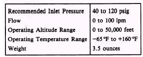 CHAPTER 12 OXYGEN-RELATED COMPONENTS Learning Objective: Upon completion of this chapter, you will be able to identify, maintain, and perform maintenance on oxygen regulators and liquid oxygen converters. Oxygen aircraft. They supply the aircrew member with the regulators are used in all naval necessary oxygen to perform all flying duties under all kinds of conditions. As a PR, you will maintain, service, and test oxygen regulators and liquid oxygen converters. This chapter will give you a basic idea of how a miniature oxygen regulator functions, as well as a panel-mounted regulator and a liquid oxygen converter. It will also cover some of the maintenance that you must perform. The miniature regulator shown in figure 12-1 is a model 29267-A1, type CRU-79/P, and this model is manufactured by Bendix Aviation Corporation. Other models are manufactured by Clifton Precision, Robert Shaw Controls Company and ARO Corporation, but all are type CRU-79/P. They are designed to regulate 100-percent oxygen to the aircrew member during flight. Table 12-1 contains the leading particulars for the regulator. The miniature regulator reduces and regulates supply oxygen pressure to provide an adequate amount for breathing under a variety of conditions. It has a safety-pressure feature that automatically maintains a positive pressure in the aircrew members mask of 0.50 to 2.5 inches of water above the surrounding air pressure. (Inches of water is a means of measuring the comparatively low pressure used in testing oxygen regulators.) This positive pressure is maintained at all altitudes up to and including 34,000 feet. Above that altitude, the pressure-breathing feature maintains a positive pressure in the mask of up to 18.0 inches of water at altitudes between 34,000 and 50,000 feet, with the positive pressure increasing in proportion to the altitude. Miniature regulators can be used routinely up to approximately 43,000 feet. However, due to human limitations, miniature regulators should