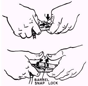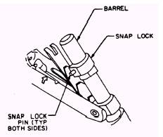 PREPARATION FOR USE When you receive an automatic parachute ripcord release from supply, there are some preparations for you to make before placing it into service. Upon removal of the ripcord release from the shipping carton, the exterior parts of the unit must be inspected for damage during shipping and storage. An inspection should be made for corrosion, dirt, dents, and cracks. If any damage or discrepancy is found, a quality deficiency report must be submitted, and a tag must be affixed to the ripcord release stating that it is not to be used. Remove this tag only after correction has been made. Fired ripcord release assemblies must not be reused. All Model 7000 automatic parachute ripcord release assemblies that fail any inspection points must have a tag affixed stating the nature of the defects. NOTE: Refer to NAVAIR 11-100-1.1 for the cartridge service life/total life. The cartridge service life must not expire prior to the next scheduled repack of the parachute assembly. WARNING YOU SHOULD EXERCISE EXTREME CAUTION WHEN HANDLING AUTO-MATIC RIPCORD RELEASE AS-SEMBLIES AFTER THE CARTRIDGE HAS BEEN INSERTED IN THE BAR-REL. DO NOT ALLOW EITHER END OF THE COVER ASSEMBLY TO BE POINTED TOWARD YOUR FACE AS HIGH VELOCITY FLAME AND SMOKE MAY BE PRODUCED IF THE CARTRIDGE GOES OFF. ANOTHER REASON FOR EXTREME CAUTION IS THE POSSIBILITY THAT THE PIS-TON OF THE RIPCORD RELEASE MAY BECOME A PROJECTILE IF THE CARTRIDGE ACCIDENTALLY FIRES. An automatic ripcord release in service must be inspected each time its parachute assembly is repacked. You must pay particular attention to detail when working on a automatic ripcord release. The importance of careful work must be impressed upon personnel actually performing the work, as well as those assigned to collateral duty inspections. You will find more detailed information concerning automatic parachute ripcord release assemblies in the Emergency Personnel and Drogue Parachute Systems Manual, NAVAIR 13-1-6.2, and the Maintenance Requirements Cards, NAVAIR 13-600-4-6-3. MAINTENANCE Maintenance on any automatic ripcord release in service must be performed each time its parachute assembly is repacked. Maintenance consists of the following: . Disarming . Inspection . Firing altitude check . Arming and assembly . Checkout of armed mechanism As you work on a automatic ripcord release assembly, you are required to perform several different types of maintenance and inspections. You are required to inspect the operational condition of the automatic ripcord release before installing it in a parachute assembly. If you find any damage or an inspection discrepancy, submit a quality deficiency report, as discussed in OPNAVINST 4790.2 (series). NOTE: Under no circumstances should an unsatisfactory ripcord release be installed. The first step in performing the normal inspection and maintenance on a automatic ripcord release is to disarm it. Then you are ready to inspect and perform the firing altitude checks. DISARMING Anytime you are required to disarm a ripcord release assembly, follow the procedures outlined in NAVAIR-13-1-6.2. The discussion that follows closely parallels those procedures. A parts breakdown can be seen in figure 2-1. NOTE: To remove the arming cable housing from the ripcord release, depress the safety retainer release (fig. 2-1). NEVER try to remove the arming cable from an armed ripcord release assembly by pulling on the cable. This fires the automatic ripcord release. 1. Open the ripcord release pocket, and remove the ripcord release only a sufficient distance to allow disassembly. 2. Remove the locking screw and washer. NOTE: The cover and power cable housing assembly and the receiver and barrel assembly are serialized matched sets. Do not mix these assemblies. 3. Slide the cover off the receiver and barrel assembly. 4. Disengage the barrel snap lock. A close-up of this operation is shown in figure 2-2. 5. Remove the cartridge from the barrel assembly (fig. 2-1). Do not proceed until the quality assurance inspector (QA) has verified this step. 6. Remove the ripcord release assembly and the arming cable housing from the parachute container.