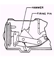 Figure 2-3.-Checking firing pin and hammer. INSPECTION To inspect the automatic ripcord release, proceed as follows: 1. Inspect the cover and power cable housing assembly for nicks, gouges, distortion, corrosion, and security of the power cable housing. 2. Inspect the power cable for freedom of movement, and secure attachment of the swaged ball and power cable eye. 3. Inspect the receiver and barrel assembly for excessive nicks, cracks, gouges, distortion, and corrosion or other damage that could cause a malfunction while in service. 4. Inspect the firing pin on the hammer for flattening, gouges, or other damage (fig. 2-3). 5. You must secure the arming pin by inserting the pin in the retainer while the barrel is unlocked. Press the pin firmly into place until it locks into the pin groove. The pin should now be held securely. Do not twist the socket as this will break the shear pin. NOTE: Early Model 7000 automatic parachute ripcord release assemblies use safety wire, as shown in figure 2-1. When inspecting these assemblies, check for security and the proper type of wire. 6. Inspect the socket for visible damage and retention of the socket and piston by a shear pin (figs. 2-1 and 2-4). 7. Inspect the snap lock pins for security and absence of damage (figs. 2-1 and 2-5). NOTE: If the tamper dot is broken, you need to torque the screw to a value of 14 1/2 to 15 1/2 inch-pounds and apply a new tamper dot.