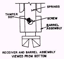 Figure 2-6.-Checking springs and tamper dot. 8. Inspect the leaf springs on the receiver and barrel assembly for damage. Make sure the retaining screw has not loosened. (Check the tamper dot on the screw and spring, as shown in figure 2-6.)