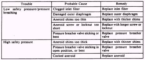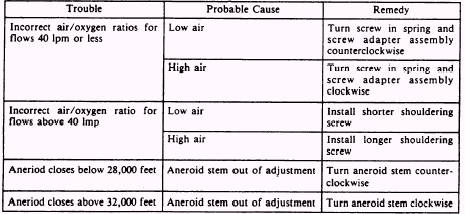 Table 12-13.-Troubleshooting (Oxygen Ratio/Aneroid Closure Tests) To perform the safety pressure and pressure breathing test, proceed as follows: 1. By using the LOW PRESSURE REGULA-TOR, apply 150 psig to the regulator inlet. If chamber altitude is not at 30,000 feet, adjust the altitude by using VACUUM CONTROL valve (B1) to increase or CHAMBER BLEED valve to decrease altitude. 2. Using the OUTPUT valve, draw flows of 0, 40, and 85 lpm through the regulator. Delivery pressure must be within limits shown on Regulator Performance Test Sheet. Maintain 3.0 inches of H2O on output manometer with OUTPUT valve while ascending to altitude. The reading for 0 lpm must also be recorded at each test altitude. 3. Repeat step 2 for each altitude shown on the Performance Test Sheet. 4. Close the OUTPUT valve and descend to sea level by using CHAMBER BLEED valve. 5. If the safety pressure breathing flows are not within limits, locate the probable cause using troubleshooting chart, table 12-14. BLINKER ASSEMBLY TEST.- This test ensures that the blinker operates correctly with a demand placed on the regulator. To perform the blinker assembly test, proceed as follows: 1. Ensure that diluter control lever is in the NORMAL OXYGEN position. 2. By using the LOW PRESSURE REGULA-TOR, apply 150 psig to the regulator inlet. 3. Using OUTPUT valve draw a 20 lpm through the regulator. The blinker must open fully. 4. Reduce output flow to 8 lpm and place the diluter control lever in the 100-percent OXYGEN position. The blinker must remain fully open. 5. Close OUTPUT valve. The blinker should close immediately. 6. Close the altitude chamber door. Ascend to altitude while maintaining 3.0 inches of H2O on the OUTPUT manometer with the OUTPUT valve. 7. By using the VACUUM CONTROL valve (B1) ascend in altitude until 17.0 inches of H2O is indicated on the PRESSURE/SUCTION manometer. 8. Open OUTPUT valve and draw a flow of 12 lpm through the regulator. The blinker should be fully open. Close OUTPUT valve and the blinker should close immediately. 9. Descend to sea level using the CHAMBER BLEED valve. 10. Adjust or replace improperly functioning blinkers. EMERGENCY PRESSURE TEST.- Deterrnine how much pressure is supplied to the user on emergency pressure. To perform the emergency pressure test, proceed as follows: 1. Ensure the diluter control lever is in the NORMAL OXYGEN position. 2. By using the LOW PRESSURE REGULA-TOR, apply 150 psig to the inlet of the regulator. 3. Open the OUTPUT valve and draw a 10 lpm flow through the regulator.