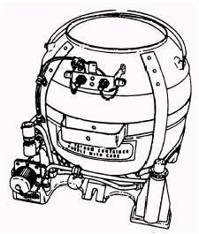 Figure 12-5.-Liquid oxygen converter assembly, type GCU-24/A, P/N 1OC-OO16-1O. liquid oxygen quantity gauge located in the aircraft, is incorporated within the sphere assembly. The quantity gauge indicates the amount of LOX, in liters, contained in the converter. Operation and performance characteristics of the GCU-24/A converter assembly (P/N 10C-0016-10) are as follows: 1. The converter is filled by attaching the LOX servicing trailer filler valve to the filler port of the fill, buildup, and vent valve on the converter. When attached, the servicing trailer filler valve depresses the nosepiece and valve poppet of the fill, buildup, and vent valve. This automatically puts the converter into the fill mode (fig. 12-6). Figure 12-7 shows the converter installed in an aircraft. 2. With the poppet depressed, the fill and vent ports of the valve are opened, and the buildup port is closed. This condition allows gas pressure built up in the inner sphere to vent to the atmosphere. As pressure is vented, LOX in the servicing trailer (which is at a greater pressure-30 psig), flows through the fill, buildup, and vent valve and into the converter. 3. As the LOX level rises in the sphere, pressure created by vaporization of liquid due to heat, turbulence, etc., is vented to the atmosphere. The converter is considered full when LOX flows in a steady stream from the overboard vent line quick disconnect.