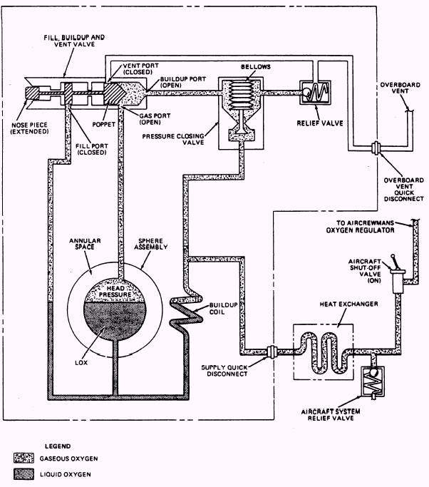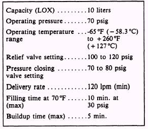 Table 12-16.-Leading Particulars for Liquid Oxygen Converter Assembly, Type GCU-24/A, P/N 10C-0016-10 4. When the converter is full and the servicing trailer filler valve is disconnected, the nosepiece and poppet of the fill, buildup and vent valve return to the extended position (fig. 12-6). This automatically puts the converter into the buildup and supply mode by closing the fill and vent ports of the vaIve, and opening the buildup port. 5. In the buildup and supply mode (fig. 12-6), LOX is forced out of the bottom of the inner sphere and into the buildup coil by the weight of the liquid. As the LOX warms and vaporizes into gaseous oxygen in the buildup coil, pressure is created. This pressure is controlled at approximately 75 psig by the opening and closing action of the pressure closing valve. 6. Gaseous oxygen travels from the buildup coil through the supply quick disconnect and the heat exchanger to a shut-off valve in the aircraft cockpit. 7. Gaseous oxygen, under pressure, also passes through the gas and buildup ports of the fill, buildup and vent valve to the upper portion of the pressure closing valve, within which is a bellows. This bellows holds the valve in the open position. As pressure builds, the bellows, which senses the increase, contracts (at approximately 75 psig), and closes the valve. 8. Without a demand being placed on the converter, pressure continues to slowly rise. If