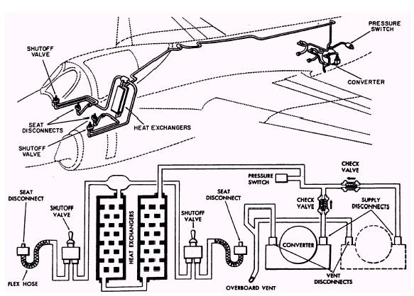 Figure 12-7.-Converter installed in an aircraft. allowed to go unchecked, pressure in excess of 12,000 psig could be generated. To prevent this potentially hazardous situation, a relief valve is incorporated. The relief valve is set to relieve excess pressure in the converter assembly at approximately 110 psig. 9. As a demand is placed on the converter by the aircrewman, LOX is forced into the buildup coil to replace consumed oxygen. As this process is repeated, the LOX level in the converter drops, increasing the void area at the top. As the size of the void area increases, pressure decreases, and is sensed by the bellows in the pressure closing valve. When pressure falls below approximately 75 psig, the bellows expand, opening the valve. With the valve open, pressure from the buildup coil passes through the valve and into the top of the converter. This pressure, coupled with the pressure created by vaporizing LOX contained in the converter, again builds to approximately 75 psig and closes the pressure closing valve. This process is repeated as long as a demand is being placed on the converter. 10. A heat exchanger is incorporated into the aircraft tubing to further warm the gaseous oxygen to a breathable temperature. 11. An additional relief valve, set at approximately 115 psig, is installed in the aircraft oxygen plumbing to provide additional protection against overpressurization of the converter and supply lines of the system.