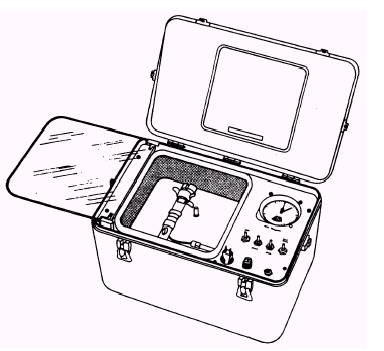 Figure 2-9.-Automatic parachute ripcord release test set. 2-5 this, you first evacuate air from a test chamber to simulate an increase in altitude. When you have achieved a simulated altitude above the preset altitude of the ripcord release, you extract the arming pin, which arms the parachute ripcord release firing mechanism. Then you bleed outside air back into the test chamber at a controlled rate to simulate a specific rate of descent. When the pressure reaches the value for which the automatic ripcord release has been set, the aneroid will unlock the sear if the pressure sensitivity is within tolerance. The test chamber, its evacuation system, instrumentation, and controls are packaged in one container. The test chamber is designed to withstand a vacuum equivalent to an altitude of 30,000 feet. The chamber holds the entire 7000 series automatic parachute ripcord release, and it includes the necessary brackets to support and position the ripcord release within the chamber during the test cycle. An access door/observation window is also provided. NOTE: Before testing an automatic parachute ripcord release, the test chamber altimeter should read 29.92 inches of mercury barometric pressure. RIPCORD RELEASE TEST PROCEDURE Plug the test unit's power cord into a 115-volt, 60 Hz, ac power source. Place the power switch in the ON position, open the test chamber door, and insert the arming pin cable into the side of the ripcord release with the aneroid end toward the operator. To test the ripcord release, follow these procedures: 1. Ensure the test chamber has been calibrated. Install the test chamber substitute arming pin into the ripcord release. If the barometric pressure reading of the altimeter isn't 29.92, you will not get a true reading of the firing altitudes. Therefore, you must adjust the altimeter to the proper setting when required. 2. Install a dummy cartridge.
