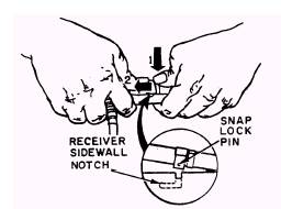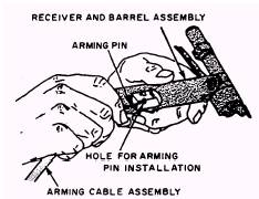 Figure 2-10.-Locking barrel assembly. CAUTION DO NOT RELEASE THE RIPCORD RELEASE FIRING MECHANISM WITHOUT A DUMMY CARTRIDGE INSTALLED, AS THIS COULD DIS-TORT THE FIREWALL. THIS DIS-TORTION COULD CAUSE A LATER MALFUNCTION. 3. Press the barrel down into position in the receiver. As the barrel reaches the proper position, exert forward pressure on the snap. lock, causing the snap lock pins to lock the barrel in position (fig. 2-10). 4. Install the barrel and receiver into the test chamber. Check your altimeter (fig. 2-9) for a setting of 29.92. 5. Evacuate the chamber to an altitude of 25,000 feet. This is done by using the climb toggle switch. 6. Decrease the altitude by using the descend toggle. The chamber simulates descent at a rate of 175 to 200 feet per second. 7. At approximately 20,000 feet actuate the arm toggle switch to withdraw the arming pin from the barrel and receiver. 8. At the firing altitude the ripcord release should fire. (You have a tolerance of plus or minus 1,000 feet at this time.) 9. Record the altitude at which the ripcord release assembly's firing pin strikes the dummy cartridge. The firing altitude is recorded on the parachute configuration, inspection, and history record. The quality assurance inspector will check this point of the procedure. WARNING AFTER TEST FIRING, YOU MUST NOT USE A METAL TOOL TO PUSH THE HAMMER AND LOCK AS-SEMBLY BACK FROM THE FIRING WALL. TAKE EXTREME CARE TO AVOID SCRATCHING OR ABRADING THE POLISHED SURFACE OF THE LOCK. THE PURPOSE OF THE LOCK ASSEMBLY IS TO MATE WITH THE ANEROID SEAR AND INITIATE FIR-ING AT A PRESCRIBED ALTITUDE. A ROUGH OR SCRATCHED LOCK-ING ASSEMBLY MAY CAUSE A HANGUP DURING THE UNLOCKING FUNCTION. NOTE: Ripcord release assemblies with part number 711-07022-30 (10,000-foot) must fire at 10,000 feet (plus or minus 1,000 feet) pressure altitude. Ripcord release assemblies with part number 711-07022-34 (14,000-foot) must fire at 14,000 feet (plus or minus 1,000 feet) pressure altitude. 10. Three firing altitude checks must be made. Any ripcord release that does not meet test requirements on all three checks will be rejected. Adjustments are not to be made. 11. Remove the dummy cartridge and inspect it for an indentation caused by the hammer firing pin striking the cartridge. This dent must be visible to the QA performing the inspection. ARMING AND ASSEMBLING THE AUTOMATIC PARACHUTE RIPCORD RELEASE The following instructions are the same type you will follow in the shop when arming and assembling the Model 7000 ripcord release. When you use the NAVAIR 13-1-6.2 manual and come to a step that is followed by "(QA)," that step must be inspected by a QA. 1. To arm the ripcord release that is installed in a parachute, your first step is to insert the arming cable housing through the holes in the parachute container and ripcord release pocket. 2. Next, feed the arming cable through the arming cable housing. Depending on application, the arming cable may be inserted at either side of receiver and barrel assembly (fig. 2-11).