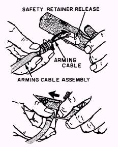 Figure 2-12.-Installing an arming cable housing. 3. With the ripcord release barrel in the open position, install the arming pin into the ripcord release. The pin must pass through the hole in the side of the receiver, through the firing mechanism lock, and out the opposite side of the receiver. 4. Next, you connect the arming cable housing to the receiver and barrel assembly. Ensure the safety retainer secures the housing to the receiver (fig. 2-12). Be sure that you check the cartridge service life at this time. You should not install a cartridge that will expire prior to the next scheduled repack of the assembly. Refer to NAVAIR 11-100-1 for the service/total life of cartridges. 5. You should enter the cartridge time delay, part number, type, expiration date, lot number, can open/installation date, the CAD DODIC (Department of Defense Identification Code), and the date of manufacture or overhaul on the parachute Configuration, Inspection, and History Record. 6. Insert a proper time-delay cartridge in the barrel. Refer to the applicable parachute chapter to determine which time-delay cartridge should be used. While you are pressing down on the barrel, look through the inspection hole in the receiver and ensure that the hammer assembly does not swing towards the firewall. If the hammer swings, the arming pin is improperly installed. Do not attempt to assemble the ripcord release any further, as this could fire the cartridge. 7. Press the barrel down into position in the receiver (fig. 2-10). As the barrel reaches proper position, exert forward pressure on the snap lock. This causes the snap lock pins to lock the barrel in position. Ensure that the snap lock is aligned with the alignment arrow. 8. Hold the ripcord release, as shown in figure 2-13, and slide the receiver and barrel assembly into the cover and power cable assembly until the holes for the screw are aligned. 9. Install the locking screw and lock washer. Apply a tamper dot to the locking screw, using red lacquer.