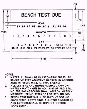 Figure 12-19.-Bench test decal. BOTTOM COUPLING, C-1, to the converter quick-disconnect coupling. 3. Open the TEST PRESSURE GAUGE-TO-BELL JAR valve, V-2. 4. Opening the OXYGEN SUPPLY valve, V-6, slowly charge the converter to 25 to 30 psig. Pressure will be indicated on the TEST PRESSURE gauge, PG-1. 5. Close the OXYGEN SUPPLY valve, V-6. Disconnect the hose assembly connected in step 2, and bleed the test stand using SYSTEM BLEED valve, V-5. Secure all test stand valves. 6. At this point, enter the amount of the converter charge in section 11 of the Performance Test Sheet, and you and a CDI sign the sheet. The original, or a copy of the Performance Test Sheet is forwarded to the operational custodian of the converter. 7. Mark the due date of the next bench test on the bench test decal (fig. 12-9). Due date is 231 days from the last bench test date. Affix this decal to the converter in a position in which it will be visible when the converter is installed in an aircraft. 8. Install dust covers or plugs in/on all open couplings prior to shipping or storage of the converter.