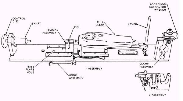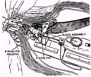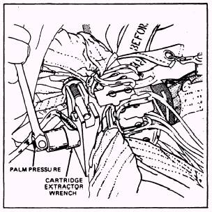 Figure 2-23.-Loosening cartridge. 10. Attach the hook assembly to the firing pin hole, and slide the hook assembly block over the nut that is attached to the pull gage. (See figure 2-21). 11. Move the switch on the pull gage to the center position. You must zero your meter needle by rotating the bezel on the dial. Move the switch to the full down position, away from the meter, for recording the pull force. 12. The QA verifies the test fixture lever firing pin releases. The pull force must go between 25 and 38 pounds. If a gun has failed the first test, it must be retested two more times. The gun must pass both retests. Record the force required to release the firing pin on the Parachute Configuration, Inspection, and History Record. When a gun fails, it is removed and returned to