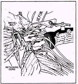 Figure 2-21.-Spreading gun test fixture. 2-12 By following the steps outlined below, you can replace the cartridge and perform the firing pin pull-force test in a safe manner. 1. Clamp the spreading gun test fixture to the packing table. Use one C-clamp positioned as close as possible to the clamp assembly. See figure 2-21 for the test fixture parts identification. 2. You must remove the cartridge extractor wrench from the swivel bolt attached to the spreading gun clamp assembly. 3. Then place the cartridge end of the spreading gun into a spreading gun clamp assembly (fig. 2-22). Ensure that the lip on the clamp assembly circles the spreading gun housing. Route the retaining cord through the vertical slot in the center of the clamp and spread suspension lines to prevent entrapment between gun and clamp. Position the swivel bolt in the horizontal slot in the clamp, and torque the swivel bolt nut to 7 1/2 foot-pounds. 4. Place the pins of the cartridge extractor wrench into holes in the cartridge. Loosen the cartridge using pressure against a 3/4-inch socket, as shown in figure 2-23. NOTE: If you have difficulty in removing the cartridge by using the extractor wrench furnished with the test fixture, use a special cartridge extractor tool. Cut and remove the retaining cord at the base of the cartridge. Place the slot of the special tool over the retaining cord pin, and loosen the cartridge by using a 1/2-inch socket. 5. Remove the spreading gun from the clamp or V-block assembly. Manually unscrew and remove the cartridge from the chamber. 6. Remove the cartridge from the retaining cord by removing the pin. Retain the pin for reinstallation if required. The old cartridge must be disposed of in accordance with current directives. 7. Remove the safety pin from the spreading gun. 8. Spread the canopy skirt hem and suspension lines to expose the cartridge chamber. Slide the spreading gun onto the test fixture shaft