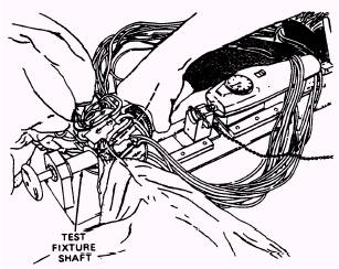 Figure 22-24.-Sliding on to test fixture. so that the shaft butts against the bottom of the cartridge chamber (fig. 2-24). 9. Open the four snap fasteners on the spreading gun extractor sleeve to expose the firing pin housing. Slide the block assembly at the center of the test fixture under the firing pin housing until the block assembly pin slides into the baseplate hole. Align the firing pin so that the hole in the firing pin is horizontal. The firing lanyard is located at the top. (See figure 2-25.)