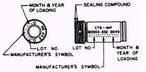 Figure 2-26.-Cartridge markings-head and side. 23. Attach the new cartridge to the retaining cord by passing the pin through the screw base of the cartridge and the loop that is located at the end of the retaining cord. NOTE: Never force the cartridge into the chamber. This could damage the gun. When a cartridge is properly installed, the base should be approximately even with the top edge of the chamber. If the cartridge base is more than one thread above the edge, remove the cartridge and check the bottom of the chamber for any obstruction, such as protruding slug pistons. 24. Having inserted the cartridge into the chamber, you tighten it manually. If the cartridge stops before the threads are engaged, remove the cartridge and again check for protruding slug pistons. Push them back if necessary. 25. Replace the gun in the clamp or V-block assembly in accordance with steps 3 and 4. Using a cartridge extractor wrench and torque wrench with a 3/4-inch socket, you must torque the cartridge to 84 inch-pounds (plus or minus 12 inch-pounds). 26. Remove the spreading gun from the clamp or V-block assembly. Do not remove the safety pin. Put the cartridge extractor wrench back on the swivel/stanchion bolt. 27. Check stowage of the firing lanyard. Restow it if necessary. 28. Close the extractor sleeve. Now your job has been completed. To install a ballistic spreader gun onto a parachute, you must refer to the Emergency Personnel and Drogue Parachute Systems Manual, NAVAIR 13-1-6.2. Repacking a parachute with a ballistic spreader gun is discussed in chapter 3 of this manual.