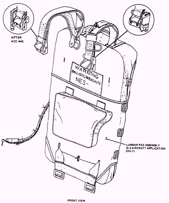 CHAPTER 3 NES-12 PERSONNEL PARACHUTE SYSTEM Learning Objective: Upon completion of this chapter, you will be able to understand the theory of operation and perform a speciaL inspection on the NES-12 parachute assembly. The modern high-performance aircraft used by the Navy today make extreme demands of emergency escape devices. The most critical time for ejection from an aircraft is at low altitudes- especially on takeoffs and landings. The ultimate goal in seat performance (to which engineers have been working) is one that safely ejects the occupant at zero airspeed and at zero altitude, at low altitudes under a high speed, or under other adverse altitude conditions. The system discussed in this chapter gives the aircrewman a zero airspeed and a zero altitude ejection system. The 1G series ejection seats separate from the aircrewman by means of a rocket that forcibly propels the seat away from the crew member after ejection. After the aircrew member ejects from the aircraft, a static line on the outside of the container pulls the external pilot chute from its pocket. The sequence of events shown in figure 3-1 commences. This static line is also attached to the arming cable for the automatic parachute ripcord release. The external pilot chute is intended to cause the parachute to open more rapidly, especially at low altitudes or during ground-level ejection. It is of a tristage design and functions as follows: At speeds from 0 to 90 knots, it will inflate to full diameter; at speeds between 90 to 250 knots, the full diameter will reduce to 24 inches; and at speeds in excess of 250 knots, it will invert, but its effective drag will be sufficient to stabilize the aircrew member during free fall and also aid in the extraction of the main canopy during deployment. At a preset altitude, the automatic ripcord release fires, pulling the ripcord pins from the locking cones, allowing the spring opening bands to open the container. The internal pilot parachute springs from the container and fills with air during this operation. The external pilot chute release assembly frees the shear link cable when the container opens. The internal pilot parachute causes the main canopy to be pulled from the container, followed by the suspension lines. A short piece of 18-pound nylon tape is used to momentarily shorten the canopy's effective length during low-speed ejection, which, in turn, promotes more positive opening characteristics. Just prior to full suspension line stretch, the ballistic spreading un fires, forcing the suspension lines out at the skirt hem. This rapidly opens the canopy and allows it to fill with air faster. Ties on the connector links break as load is applied, allowing the risers to be pulled from the container. NOTE: If the spreading gun fails to fire, the slugs separate from the gun assembly at full suspension line stretch, allowing the canopy to open aerodynamically. The aircrew member hangs suspended in his harness from the quick-release shoulder fittings during descent. The parachute has the four-line release system that was described previously. By manually actuating this system, the aircrewman is able to maneuver the parachute to a less hazardous landing site and to reduce oscillation during descent. Upon landing, the canopy and suspension lines can be disengaged from the integrated torso suit by means of the quick-release shoulder fittings. NOTE: After the incorporation of Aircrew System Change 446, the seawater activated release system provides an automatic backup method of releasing the risers after the crew member makes a seawater entry.