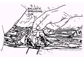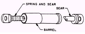 Figure 3-10.-Override disconnect. in figure 3-10. It consists of two hooks or sears that are kept in engagement as long as they are inside the barrel. As long as tension is applied to the external pilot chute connection, the override will remain locked. Once the internal pilot chute takes control of the tension, the override connection will release or unlock, allowing the external pilot chute to be released. To attach the external pilot parachute, proceed as follows: 1. Insert the spring and sear (fig. 3-10) into the wide end of the barrel assembly of the override disconnect. The spring and sear will be connected to the external pilot chute bridle, as shown in figure 3-11. With the aid of a temporary locking pin, push the sear into the barrel until it is protruding from the other end. 2. Engage the sear attached to the internal pilot chute connector cord with the sear, which is protruding from the override disconnect, and release the tension by removing the temporary locking pin. This will cause the two sears to lock within the barrel assembly of the override disconnect. As you can see in figure 3-11, the external and internal pilot chutes are now locked together. 3. Tack the override disconnect to the internal pilot parachute connector strap 3 inches (plus or minus 1/4 inch) above the knot, securing the connector strap to the vent lines at two places. Use two turns of waxed nylon 6-cord (V-T0295), doubled, for each tacking. Tie the ends with a surgeon's knot followed by a square knot. SUSPENSION LINE CONTINUITY CHECK WITH SPREADING GUN INSTALLED Although you have checked the continuity of suspension lines prior to installing the spreader gun, they must be checked again to ensure that you haven't gotten any lines out of sequence or have crossed a line causing a twist. To check suspension lines continuity, proceed as follows: WARNING ENSURE THE SAFETY PIN IS IN-STALLED IN THE SPREADING GUN (FIG. 3-12).
