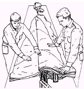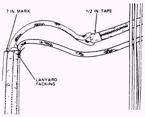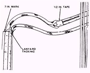 Figure 3-16. Inspect the firing lanyard for proper stowage, as shown in figure 3-17. In this inspection you may find that the firing lanyard has been pulled out of the stowage sleeve, or it may have been improperly stowed. To restow the firng lanyard, cut a piece of Type I nylon cord 30 inches long. This will aid you in stowing the lanyard. Measure 7 inches from the sewn loop at the top of the firing lanyard and make a mark. This mark will leave you 7 inches of slack between the