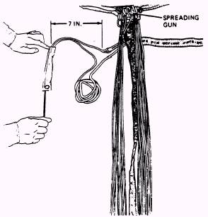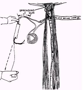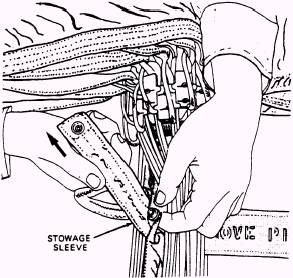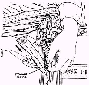 STOWAGE OF FIRING LANYARD INTO EXTRACTOR SLEEVE In stowing the firing lanyard into the extractor sleeve, you must first remember not to remove the spreading gun safety pin at any time during this procedure. Now you open the extractor sleeve fasteners on each side of the spreading gun safety pin; release the fastener holding the stowage sleeve to the extractor sleeve; and remove the stowage sleeve from the extractor sleeve, as shown in sewn loop and the stowage sleeve. Form a bight the length of the stowage sleeve in the firing lanyard, and by using the Type I cord and a bodkin, pull the firing lanyard into the stowage sleeve, stopping at the bottom of the sleeve. (See figures 3-18 and 3-19).