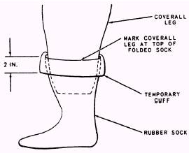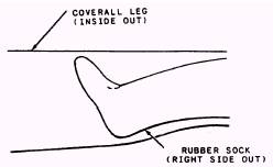 SRU-2WP RUBBER SOCKS.- The SRU-25/P rubber socks are supplied in eight sizes. The rubber socks are one-piece and are molded to shape to provide comfort and a good fit. The tops of the socks extend above the flight boots to reduce bulk and restriction. The size of the SRU-25/P rubber socks will be governed by the size of the flight boot to be used. Usually, a rubber sock one size smaller than the boot to be used will provide an acceptable fit. The aircrew member should wear a pair of heavy wool socks, then put on a pair of SRU-25/P rubber socks corresponding to his normal boot size. The rubber socks should be worn in a slightly stretched condition to prevent wrinkles or bulk in the boot, but they must not be too tight. Larger or smaller rubber socks and/or boots may be required for a proper fit. To fit the rubber socks, select the correct size of rubber socks and fit them to the CWU-62/P coveralls as follows: 1. Have the aircrew member put on the antiexposure assembly (except the hood, mittens, and flight suit), the MA-2 torso harness, if applicable, and a pair of properly fitted, heavy wool socks. 2. Mark the coverall legs and socks (L and R) on the inside and front and back. This is to ensure the socks are matched to the correct leg during installation. 3. Have the aircrew member sit in a straightback chair with his legs drawn back, heels directly below the kneecaps, and his feet flat on the floor. 4. Turn the top 2 inches of sock down, forming a temporary cuff. Mark the circumference of the coverall legs where they meet the