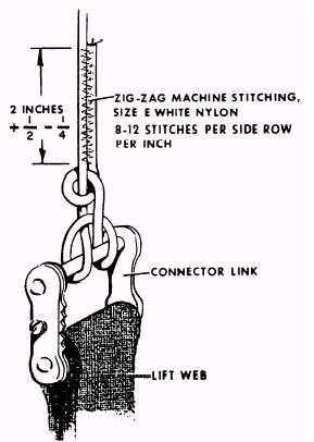 SUSPENSION LINES The suspension lines form a net or skeleton for the canopy and absorb much of the shock load. Therefore, when being assembled, they must be placed under a 20-pound tension, marked, and cut as a group to assure equal distribution of the shock load. The 28 suspension lines counted at the links are actually 14 lines, 75 feet 4 inches in length. These lines run continuously from link to link; that is, each line is secured to a connector link on one side of the canopy, runs up and over the canopy, and down to a link on the opposite side. Type III nylon suspension line (with a minimum tensile strength of 550 pounds) is used on all main canopies and vane-type pilot chutes. This line consists of a loosely woven outer covering called a sleeve, and several strong inner cords called the core. This core provides the greater portion of the strength of the suspension line. The suspension lines are attached to the connector links by tying a clove hitch, then a halfhitch, and completing the attachment with 2 (1/2 or - 1/4) inches of zigzag stitching. These lines are attached to the lift webs with removable connector links. One of the four removable connector links is shown in figure 1-9. See the four links (the ends of the suspension lines without the lift webs) in figure 1-5. To prevent the canopy on the 28-foot parachute from slipping along the suspension lines, each line is anchored by zigzag stitching at several points to the radial seams through which it passes. One-half inch of slack is allowed in the vicinity of the skirt between the zigzag sewing points to relieve the strain during opening shock. The parachute container is designed to house and protect the pilot chute, main canopy, and suspension lines. There are as many different styles of containers as there are parachutes. They all have the same basic opening procedures. There are four flaps: top, bottom, left, and right. These flaps are held closed by two or four ripcord pins inserted through locking cones. To open the parachute container, the ripcord pins must be removed either manually or automatically. This allows the flaps to open and the pilot chute to spring from the pack. The pilot chute then pulls the canopy out.