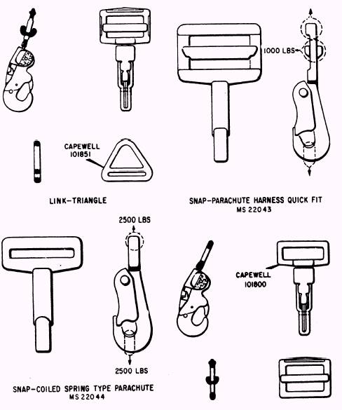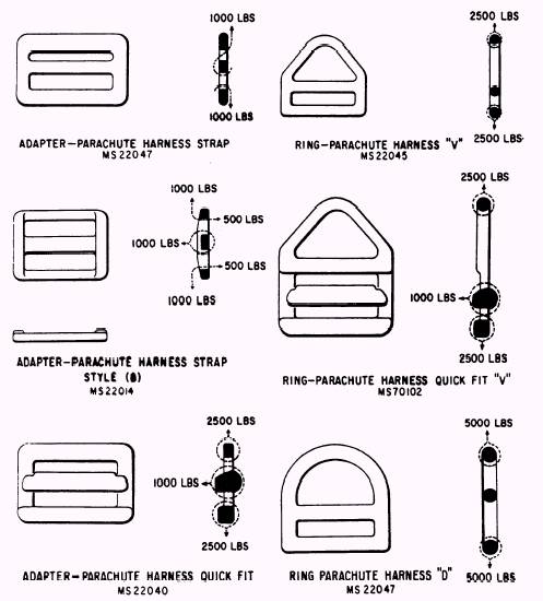 Figure 1-10.-Harness hardware (page 2). ADAPTERS Two types of adapters are used with a regular quick-fit type harness. They are the regular harness adapter and the friction adapter. The harness adjuster adapter is used to adjust the harness to the wearer, and the friction quick-fit adapter has a grip slide bar, which allows the wearer to make quick adjustments to the harness. SNAPS There are several types of snaps used with parachutes. They are the plain harness snap, the quick-fit snap, and the quick-connector snap. The harness snap is a plain hook-shaped, springactuated guard, which snaps over a V-ring to secure two parts of the harness together. The quick-fit snap is similar except that it has a grip slide bar. The quick-connector snap is similar to the harness snap and is used as a means to quickly attach the Navy chest-type parachute to the two D-rings on the Navy chest-type harness.