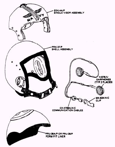 LAP BELT AND SHOULDER ADJUSTMENTS To make the lap belt and shoulder harness adjustments, the aircrew member must sit in an ejection seat. Connect the lap belt fitting and adjust the lap belt until it is snug. Leave no slack in the lap belt. If the lap belt has been completely adjusted to the stop and slack remains, try a smaller harness. If this does not work, the aircrew member is considered a candidate for a customfit harness. The canopy release/riser/shoulder restraint system must be connected. With the aircrew member sitting upright, shoulders back, there should be no slack in the shoulder harness restraint. If the shoulder harness is fully retracted and there is slack, adjust the torso harness Koch fitting down until slack is removed. Personnel whose prescribed torso harness does not meet the above criteria will be further evaluated in other size MA-2 harnesses, if appropriate. INSPECTIONS There are two inspections that are performed on the MA-2 torso harness-the preflight check and the calendar or initial issue inspection. The MA-2 preflight check is done before each flight and at intervals not to exceed 2 weeks. This check is to be performed by the aircrew member. The other inspection is a calendar or initial issue inspection. The MA-2 torso harness must be inspected upon initial issue and at intervals coinciding with inspection of personal issue protective equipment (i.e., life preserver, helmet, etc.). These inspections consist of the following: NOTE: Before you perform any inspection on the torso harness, you must determine if the harness is overaged. You would be wasting your time to perform an inspection and then find out that the harness isn't fit for service because of being overaged. 1. Check the harness for its service life by first checking the date of its manufacture. This date is located on the inside of the right front leg strap. The service/total life of the torso harness is 12 years from when it was placed in service, or 15 years from the date of manufacture, whichever occurs first. When an assembly reaches its service life limit, remove it from service and forward it to supply for disposition. If the torso harness hasn't reached 15 years from date of manufacture, you still have to check the service life. The date the torso harness was placed into service is stenciled in the center of the lap belt strap on the outer surface. Whenever an in-service MA-2 lacks the stenciled start of service date, its service life expires 12 years from its date of manufacture. Now you are ready to perform a calendar inspection. 2. Check the chest strap friction adapter for corrosion, distortion, cracks, presence of the locking bar, sharp edges, and security of the attachment. 3. Inspect the shoulder canopy release fittings for corrosion, distortion, presence of the locking bar, absence of sharp edges, proper routing of the webbing, and security of the pin and locking screw. Ensure that the slot head screw is installed and the red lacquer tamper dot is intact. 4. Inspect the lap belt quick-release adapter for corrosion, distortion, sharp edges, and security of attachment. 5. Check the adjustable links located at the rear inside of the suit for corrosion, distortion, cracks, and sharp edges. Ensure that the chest strap webbing is routed through these links. 6. Check the entrance slide fastener for corrosion, missing teeth, presence of sliders (single slider on the MA-2 cutaway modified), security of attachment, and ease of operation. 7. Inspect the eyes and hooks at the entrance for damage and security of attachment. 8. Inspect the gated D-ring or V-ring at the right shoulder for corrosion, distortion, cracks, and sharp edges. 9. Check the life preserver retention strap for cuts, rips, frayed or weakened webbing, security of stitching, and presence and condition of snap fasteners. 10. Inspect the fabric panels for cuts, tears, fraying, deterioration, and security of stitching. 11. Inspect the harness webbing for cuts, tears, fraying, deterioration, and security of stitching. 12. Repair any discrepancies and update the MA-2 configuration in accordance with procedures outlined in NAVAIR 13-1-6.2. General repair on the MA-2 consists of replacement of the hardware and repair of cloth. Do not replace any hardware that requires restitching of the harness webbing. Harnesses that are damaged must be discarded. For more detailed information concerning repairs and modification to the MA-2 and cutaway modified torso harness suits, refer to NAVAIR 13-6-1.2. HELMETS The wearing of protective helmets while flying in Navy aircraft depends upon the designation of the aircraft. You will find that aircraft such as fighters, attack planes, and helicopters usually require aircrew members to wear a protective helmet during takeoff, in flight, and landing. Other aircraft may require that the helmet be worn only during takeoff and landing. The Navy headgear for an aircrew member is considered to be a pilot's protective equipment. Maintenance and upkeep is the responsibility of the Aircrew Survival Equipmentman. There are a number of different types of headgear. Each has its own specific function. As you work with the different types, you'll find that with very little effort, you can change their basic
