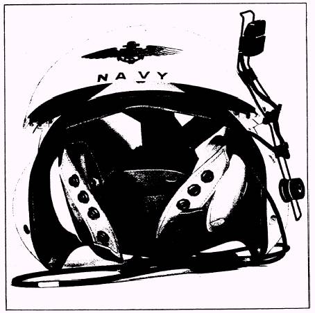 Figure 4-16.-SPH-3c protective helmet. 4-23 The SPH-3C helmet protects the wearer's head during in-flight buffeting or crash landings. It is designed to distribute impact forces over the entire head, and to absorb these forces so that a minimum amount of impact reaches the wearer's head. The SPH-3C helmet is supplied in two sizes, regular and extra large. The helmet consists of an outer shell assembly, an inner foam liner, sizing liner, inner cloth liner assembly, dual integrated visor, communication cord set, and a microphone adapter. The outer shell assembly is fabricated from Kevlar and polyester resin, and it provides impact and penetration protection. An edge roll, made of neoprene foam, provides protection from the helmet edges. The inner foam liner is made of cellular polystyrene sheets molded to fit the inside contour of the outer shell. The liner is provided to absorb and dissipate impact forces. The sizing liner, which is optional, aids in fitting the helmet to the aircrew member's head contour by padding the helmet at the nape of the neck. Sizing liners are provided in 1/4-, 1/2-, and 5/8-inch sizes. The inner cloth liner assembly includes the sonic earcup assemblies and foam pads for sizing and comfort; it also has adjustable crown and nape straps. The dual integrated visor provides protection from sun glare, dust, windblast, foreign particles, and flash fires. The visors are protected by a molded fiberglass housing when not in use. Two visors, clear and neutral, are available. The percentage of visible light transmittance of the neutral visor is 8 to 16 percent. The percentage of light transmittance of the clear visor is 87 percent or greater. The communications cord set connects the aircraft communications system to the helmet earphones. The microphone adapter, located on the helmet, allows attachment of a boom-type microphone. Fitting The SPH-3C protective helmet must be individually fitted to the aircrew member. For maximum protection, comfort, and sound attenuation, a good fit is a snug fit at the cheeks, forehead, and nape of the neck. A loose fitting helmet is more apt to produce pressure areas and discomfort. If the helmet moves independently of the head, readjust the sizing liners, spacers, and adjusting straps. If necessary, file and sand the nose indentation to fit the contour of the aircrew member's nose. Ensure that the visor at the nose indentation is free of nicks and roughness. Maintenance Procedures Minimal maintenance, which is cleaning the visor and outer shell, can be performed by the aircrew member as needed. All other maintenance operations must be performed upon issue and at least every 90 days thereafter by qualified personnel at the lowest level of maintenance possible. Inspect the sizing liners and inner foam liner for looseness, re-cement where applicable, and replace worn or torn sizing liners. Inspect the shell assembly for cracks, dents, scratches, splits, and delamination. Inspect all hardware for damage and security of attachment, tighten or replace hardware as necessary. Inspect straps, communications cord set, earphones, and dual visor assembly for damage. Replace parts as necessary. The visor may be cleaned with mild soap and water and dried with a soft, clean cloth. To remove minor scratches or remaining soiled areas, use acrylic plastic polish. To preserve the visor's plastic surface, use polishing wax for the final application. Do not use solvent or abrasive-type cleaners. The oxygen mask is the final link in conveying oxygen from the aircraft system to the user. A satisfactory regulator and oxygen system or a full cylinder' of oxygen is of little value to a pilot if his oxygen mask is not operating properly in every respect. The oxygen mask is the pilot's personal equipment; that is, after initial fitting, they are retained by the individual. Fitting, adjustments, maintenance, cleaning, and incorporating modifications are the responsibility of the PR. The important factor to remember about identifying any oxygen mask is its compatibility with the oxygen system with which the mask is to be mated. PRESSURE-DEMAND OXYGEN MASK MBU-12/P Oxygen mask assemblies are designed to be worn over the face, forming a seal to the cheeks over the bridge of the nose and under the chin. The mask is designed for use with a regulator, which provides breathing gas (100-percent oxygen or oxygen diluted with air) upon demand at a pressure schedule dependent on the altitude. The mask can also be used with continuous-flow bailout or walkaround oxygen sources. The mask also provides facial protection from projectiles and fire, as well as working at depths of 16 feet underwater. A properly fitted oxygen mask is also essential to helmet retention in high-speed ejections. The facepiece permits utilization of the valsalva maneuver to clear clogged sinuses by holding your nose with your mouth shut and trying to exhale. Then open your mouth wider. This operation will clear most sinus cloggings. The MBU-12/P pressure-demand 02 mask is the basic mask used to configure any of the following oxygen mask assemblies: