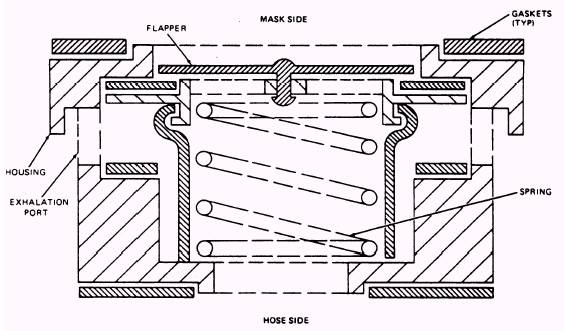 Figure 4-18.-Cross-sectional view of a combination inhalation/exhalation valve. The MBU-12/P oxygen mask subassembly is a lightweight, low profile, pressure-demand type of oxygen mask. The mask features an integral facepiece/hard shell. The facepiece is of pliable silicone and the hard shell is of polysulphonate. The mask also features a combination inhalation/exhalation valve, a flexible, soft silicone hose, and an MS27796 connector. The mask is fitted with an antistretch cord, which is secured at the upper end to the valve and at the lower end to the MS27796 connector. The hard shell is outfitted with a microphone receptacle assembly on the outside and a microphone bracket on the inside for positioning the noise canceling microphone.