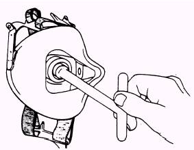 Figure 4-27.-Removing locking nut. By using a valve wrench, as shown in figure 4-27, unscrew the valve nut and remove the locking nut, bearing washer, and isolation washer from the inside of the mask. This will allow the valve, sealing washer, delivery tube, and connector assembly to be removed as a unit from the outside of the mask. Hold the base portion of the valve and submerge the operating portion of the valve into the solution. Normally, only a few seconds are required to remove any stains and residue. For stubborn residues, use a cotton swab saturated with benzalkonium chloride and rub lightly to remove. Gently shake excess solution from oxygen valve and allow it to air dry completely. CHAPTER 5 RESCUE AND SURVIVAL EQUIPMENT Learning Objective: Upon completion of this chapter, you will be able to recognize, inspect, and maintain survival items and rescue equipment. When an aircrewman has to leave his aircraft in a hostile environment, survival items provide a means of sustaining life, attracting the attention of rescuers, and aid in evading the enemy. Survival items may be packed in life rafts, droppable kits, and kits intended to be carried or worn by the aircrewman. As an Aircrew Survival Equipmentman, your responsibility to the aircrewman is to maintain these survival items. You need to know how they work and be able to pass that information on to the aircrewman. Many of the items that are frequently carried by the aircrewman are discussed in the following text. The ones that are not covered in this chapter are described in the NAVAIR 13-1-6.5 manual. SIGNALING EQUIPMENT AND DEVICES The following items are used to attract the attention of a rescue team. With the proper knowledge, ability, and caution, these items can provide invaluable assistance in a survival situation. DYE MARKER The dye marker (fig. 5-1) is an aniline dye powder in a sealed container. When placed in the water, it produces a bright color that appears orange or fluorescent green-depending on how the light strikes it. It is used to attract the attention of rescue aircraft. The dye is exhausted from the package in 20 to 30 minutes and ceases to be a good target after 1 hour. The dye-exposed water