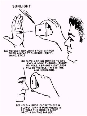 SIGNALING MIRROR The emergency signaling mirror is approximately 3 by 5 inches and consists of an aluminized reflecting glass mirror, a back cover glass, and a sighting device. It is used by personnel in rafts or on land to attract the attention of passing aircraft or ships by reflection, either in sunlight or in hazy weather. The reflections of this shatterproof mirror can be seen at a distance 3 to 5 times as great as those from which a raft can be sighted at sea. On a clear sunny day, the mirror