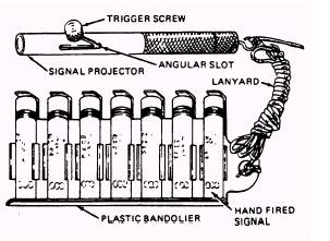 Figure 5-3.-Mk 79 Mod 0 illumination signal kit. Each cartridge flare has a minimum duration of 4 1/2 seconds and can be launched up to 250 feet. When the launcher is stored in the survival vest, it should be in the COCKED position and empty (fig. 5-3). Refer to NAVAIR 11-15-7 for proper handling and storage of the signal kit. MK 13, MOD 0 SIGNAL FLARE The Mk 13, Mod 0 signal flare is intended to attract the attention of SAR aircraft and to give them drift direction. To avoid being burned by sparks, the ignited Mk 13, Mod 0 signal must be held at arms length and no more than shoulder high. If the Mk 13, Mod 0 signal is being used at sea, hold it over the side of the life raft to prevent damage to the life raft from hot residue. The Mk 13, Mod 0 signal may be put out by dousing in water or snuffing in sand. Refer to NAVAIR 11-15-7 for precautions, handling, and storage procedures. The Mk 13, Mod 0 consists of a metal cylinder closed at each end. There is a tear friction tape igniter on a clip at each end. One end contains a red flare for nighttime use; the opposite end houses an orange smoke signal for daytime use. Each end of the signal burns approximately 20 seconds. The nighttime end of the flare has protrusions that you can feel in the dark. On the outside of the Mk 13, Mod 0 flare are operating instructions and a lot number (fig. 5-4). The lot number should be checked each time the flare is inspected to ensure that the flare is still serviceable. A list of lot numbers that are not serviceable can be found in current aircrew