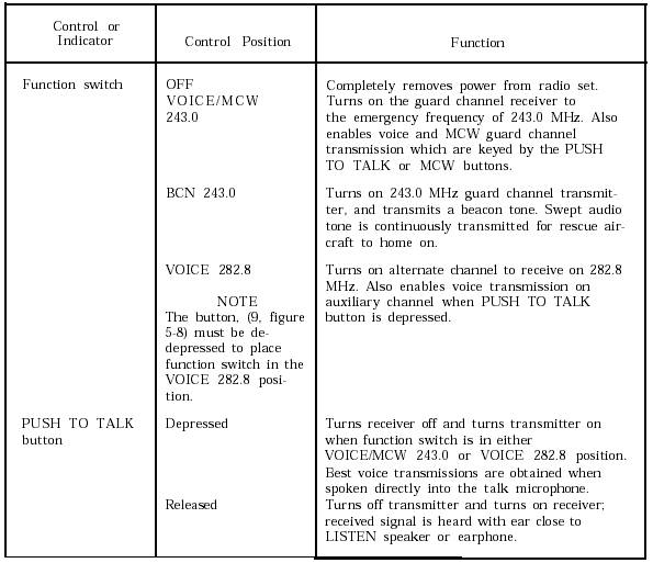 as appropriate. The antenna snaps into an upright position. Fully extend all five telescopic sections of the half-wave antenna by grasping it by its tip and pulling outward.2. Set the function switch to the mode of operation that you want. The function switch is set by rotating the thumb knob on the right-hand side so that the arrow points to the mode selected. The function switch is detented and clicks into each position. Rotate the knob down one click (from OFF) for VOICE/MCW 243.0 operation, or two clicks for BCN 243.0 operation. For VOICE 282.8 operation (secondary channel), push the button with the arrow and rotate the function switch knob up one click.3. For voice operation, hold the radio set and adjust the VOL control. To transmit, push down the PRESS TO TALK button and speak directly into the TALK microphone.4. If guard channel steady-tone transmission or Morse code operation is desired, set the function switch to VOICE/MCW 243.0. Depress the MCW button to transmit the tone. Listen for the sidetone in the LISTEN speaker or earphone while the MCW button is depressed. This sidetone indicates proper transmitter operation.5. For guard channel beacon operation, set the function switch to BCN 243.0. The transmitter continuously sends the swept-tone beacon signal at this setting. Listen for the sidetone as an indication of proper operation. In the beacon mode, the sidetone is a chirping sound.NOTE: Since the transmitter is keyed automatically in the beacon mode, and since continuous transmission may be needed for a prolonged period of time, the AN/PRC-90 may be placed upright on a flat surface. It will then transmit automatically.AN/URT-33A BEACON SET RADIO The Beacon Set Radio, AN/URT-33A (figs. 5-9 and 5-10), is an emergency radio beacon transmitter that, when properly actuated, transmits a tone-modulated radio frequency signal on the emergency guard frequency of 243.0 MHz. Although the AN/URT-33A was designed to be placed into a parachute pack, the Navy normally places the beacon radio into the seat pan (RSSK) or life rafts. Instructions for properly rigging the AN/URT-33A can be found in NAVAIR 13-1-6.1.The AN/URT-33 radio has two types of antennae. One type is the flexible wire antenna. This antenna is used during parachute descent