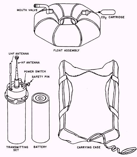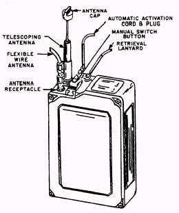 Figure 5-11.-Transmitting set, radio, AN/PRT-5, identification of components. 5-11 transmitter that, when properly activated, transmits a tone-modulated radio frequency signal on the emergency guard frequencies of 8.364 MHz and 243.0 MHz simultaneously. The transmitting set includes an inflatable float assembly that keeps the transmitting set afloat at sea, and provides a support platform on land. The entire set is packed in a carrying case for stowing in a life raft. The transmitting set is intended for signaling the location of downed aircraft or airmen. Because it provides signals in both the high frequency (HF) and ultra high frequency (UHF) portions of the spectrum, it can be detected by search aircraft, surface vessels, and coastal-based stations at considerable distances. The battery pack is designed to provide 72 hours of continuous operation at 25C (77F) with at least 250 milliwatts of output from each transmitter at the end of this period. The transmitting set will continue to transmit until the battery pack is completely discharged. Modulation of the transmitter is by internal means only. No provision has been made for voice or code communications, or for receiving signals from search craft. To prepare the radio for use is a simple procedure. 1. Pull the free end of the UHF antenna through the grommet in the float assembly to allow the antenna to stand vertically. 2. Unscrew the top section cap of the telescopic HF antenna, and pull the antenna out to its full length. When fully raised the antenna sections are alternate black and gray with the top section gray. The antenna, when fully extended, is approximately 9 feet high. (See figure 5-12.) 3. Pull out the switch safety pin (fig. 5-11). 4. Turn the POWER toggle switch to ON (fig. 5-11). 5. Place the entire assembly in the water and tow it behind the life raft. 6. When operating on land, be sure the transmitting set is placed on level ground so that the antennas are vertical. Do not stand close to the transmitting set because this can cause changes in the radiation pattern of the transmitted signals. 7. If desired, the safety pin can be replaced to prevent the transmitting set from being turned off accidentally. |