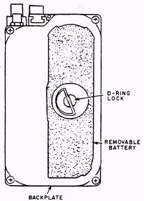 Figure 5-10.-Beacon set, radio, AN/URT-33A (rear view). since the radio is activated when the aircrewman leaves the aircraft.The flexible wire antenna serves as the principal antenna during descent. Upon landing, the flexible antenna is removed by the aircrewman, and a telescopic antenna that is built into the radio is used.The AN/URT-33A radio is battery-operated. The battery is a mercury type with a storage life of 24 months, provided that the storage temperature is 70F. At a storage temperature of 100F, the storage life is only 12 months. For survival equipment applications, such as rigid seat survival kits and life rafts, the service life of the battery assembly is 2 years from the date of manufacture, 225 days from the date placed into service, or 231 days for the SKU-2/A or RSSK-7 seat survival kit. Ensure that the battery service life does not expire prior to the next scheduled inspection of the assembly in which the radio beacon set is installed.AN/PRT-5 TRANSMITTING SET Transmitting Set, Radio AN/PRT-5 (fig. 5-11) is a battery-operated, emergency beacon