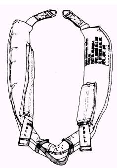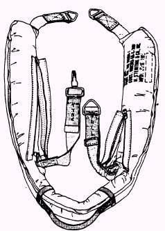 SURVIVOR'S SLING The survivor's sling is a buoyant device consisting of a kapok filling encased in a bright yellow waterproof cover to make it highly visible during rescue operations. Webbing, reeved through the cover with both ends terminating in two V-rings, is used to attach the sling to the helicopter rescue hook. Two retainer straps, one long with a quick-ejector snap and one short with a V-ring, are fastened to the webbing of the sling and are enclosed in slide fastener-secured envelopes. Refer to figures 5-13 and 5-14. The survivor's sling (also known as the "horse collar" and rescue sling) is used to assist personnel performing rescue work from a helicopter over water or land. The survivor's sling is lowered on a hoist cable from a helicopter to the rescue swimmer and survivor. The sling is designed to accommodate one survivor at a time.
