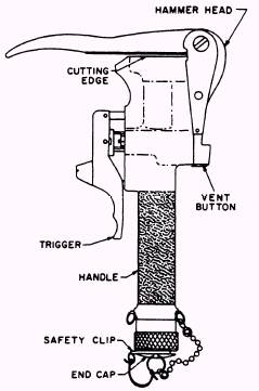 Figure 5-22.-Cable grip. failure. The cable grip is capable of supporting 1,000 pounds. (See figure 5-22.) The cable grip is an emergency condition device used by personnel performing rescue operations from a helicopter when the rescue hoist has a malfunction that renders the hoist inoperable. The cable grip is used for quick temporary attachment to the hoist cable. Maintenance The aircrewman's responsibility for maintenance of the cable grip is limited to a freshwater wash and to informing maintenance control that it has been used. Repairs or other actions required are performed by organizationallevel maintenance or above. All cable grips are subject to a calendar inspection upon issue and at intervals of 225 days. To inspect the condition of the cable grip, proceed as follows: 1. Inspect for missing, bent, fractured or damaged components. 2. Check hardware for security of attachment, corrosion, wear, and ease of operation. 3. Check for sharp edges and projections. Cleaning Clean the cable grip every time it has been immersed in salt water. To clean it, proceed as follows: 1. Clean devices with an acceptable cleaning agent. 2. Remove all foreign objects with lowpressure air. 3. Lubricate all movable parts of the cable grip with lubricating oil. Wipe off any excess oil with clean, dry, lint-free cloth. PNEUMATIC RESCUE HAND TOOL The pneumatic rescue hand tool is a cartridgeoperated device. A chamber within the handle secures a 3,000 psi nitrogen gas cylinder, which provides a very powerful force against the cutting blade. The case is made of nylon webbing, 12 1/2 inches long and 5 3/4 inches wide at the top, tapering to 3 1/4 inches wide at the bottom. A 46-inch lanyard and baby swivel hook, attached to the upper grommet, are designed for