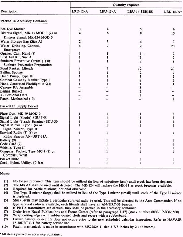 Table 6-5.-Life Raft Survival Item Requirements and Item Storage Containers for LRU-12/A, LRU-13/A, LRU-14 Series. and LRU-15/A Life Rafts