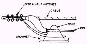 Figure 6-4.-Safety tying ripcord. 11. (Snap the ripcord protector flap closed, position the ripcord handle under the carrying case end flap, and snap the end flap closed). 12. (Ensure that the inflation valve actuating handle is positioned outside the carrying case end flap, and snap the end flap closed). When the LRU-13/A life raft assembly is packed for installation into the aircraft nacelle or raft compartment, follow procedures outlined in the applicable aircraft MIM. All LRU-13/A life raft assemblies installed in C-1 aircraft must be packed for downpull inflation using the "snap hook" remote actuator assembly, which consists of a snap hook pull cable assembly and a pull cable housing assembly. In no instance should "ice-tong" remote actuator assemblies be used in C-1 aircraft. |
