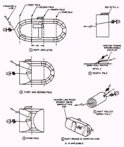 Figure 6-6.-LRU-14 series folding procedures (droppable). 6-15 between the circular tubes; and a boarding ramp permanently attached to each circular tube. The floor is equipped with a built-in inflatable floor support, and the inflatable boarding ramps are located on opposite sides of the raft. A sea anchor, used to retard drifting, is stowed in the sea anchor pocket, which is located at the junction of the circular tubes. An inner lifeline, boarding handles, a heaving line, and emergency survival equipment, stowed in the accessory container, are provided for the safety and survival of the aircrewmen. The inner lifeline, attached to the floor, and the boarding handles, attached to the circular tubes and boarding ramps, are used to secure the accessory container to the raft. Topping-off valves are located on each side of the tubes. A topping-off valve is also located on each side of the floor support. The LRU-15/A life raft assembly parts and nomenclature are shown in figure 6-7. |