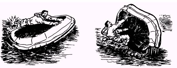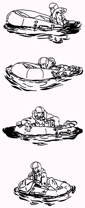 BOARDING THE RAFT The best method for boarding the multiplace life raft is to use the boarding stirrup located on the stem of the LRU-12/A, -13/A, and -14 series. This stirrup will allow the aircrewman to board the raft from the stern; boarding from the stern will lessen the possibility y of capsizing the raft (fig. 6-8). If the raft should capsize, it is best to approach it from the side on which the CO2 cylinder is installed. The survivor reaches across the raft and grasps the righting handle farthest from the cylinder. Then, by sliding back into the water and pulling on the righting handle at the same time, the raft will turn right side up. By using this method, there will be no chance of the CO2 cylinder hitting the survivor when he rights the raft (fig. 6-9). Another important point to remember in righting the raft is to note the wind and take advantage of it. It is very hard to right a raft against the wind. SAFETY PRECAUTIONS IN BOARDING RAFTS Extreme care should be taken when boarding rafts or assisting personnel into the raft from the water. This is particularly so if these persons are wearing parachute harness or life vests. Once in