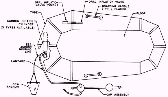 Figure 6-10.-LRU-7/P life raft assembly, parts nomenclature. 6-19 LRU-7/P is used with a modified SP-1A seat pan and NS-3 and NES-21A parachutes. |