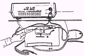 Figure 6-21.-Testing battery. Inspect life preserver inflation assemblies as follows: Remove the carbon dioxide cylinder from the valve assembly. Examine the inflation device, actuating lever and lanyard, and locking pins for fraying, corrosion, stripped threads, and other damage. If required, remove any sharp edges from the valve with a fine, round file. On LPU-28/P, LPU-30/P, and LPP life preservers, operate the toggle three or four times. Ensure that the lever moves freely and the piercing pin moves properly inside valve body. On life preservers with beaded inflation handles, operate beaded inflation handle three or four times. Ensure that the lever moves freely and the piercing pin moves properly inside valve body. Ensure that the packaging cord loop is not pinched between the piercing pin and the actuating lever. If there is free play in the actuating lever when it is in its cocked position, the packaging cord loop is pinched. If necessary, reinstall the cord. Refer to NAVAIR 13-1-6.1. NOTE: Each time the inflation assembly gaskets or the inflation assembly is removed and replaced for any reason, a functional test must be conducted. Use new gaskets when you replace the device. If any discrepancy is noted in the inflation device that is not repairable, remove the assembly and install a new inflation device. If carbon dioxide cylinder locking screws are installed on LPA type and LPU type life preservers, remove them. Ensure that CO2 cylinder locking screws are installed on LPU-30/P life preservers. Inflation Lanyard Pull Test Special Equipment Required Quantity Description Reference Number 1 Pull-Scale, DPP-50 0 to 50 lb or equivalent