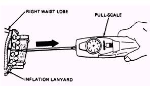 Figure 6-22.-Inflation lanyard pull test. To perform the inflation lanyard pull test, proceed as follows: 1. Ensure that the carbon dioxide cylinders have been removed. Actuate the inflation assembly. This test is testing the lanyard itself. It isn't designed to test the pull of the inflation assembly. 2. On life preservers with beaded inflation handles, attach a pull scale to top end (end opposite inflation lanyard) of beaded inflation handle (fig. 6-22). 3. On LPP and LPA-1/1A life preservers, attach the pull scale to the actuating lanyard at the binder knot immediately above the knob. 4. Exert a 25-pound straight pull on the inflation lanyard. Remove scale. 5. Examine the inflation lanyard for frays, ruptures, thin spots, split casing, and security of knots. 6. Replace any unsatisfactory inflation lanyards. Installation of Cylinders: LPA-1/1A (Series), LPA-2 (Series), LPU-21/P (Series), LPU-30/P, and LPP-1 (Series) Prior to installing any CO2 cylinder, it must be weighed and the threads cleaned. By using the cylinder thread chaser die, you turn the thread chaser to the full extent of the threads on the CO2 cylinder to cut free any excessive cadmium plating covering the threads (fig. 6-23). Weigh the charged cylinder and compare the stamped minimum weight with the scale weight. Discard and replace the cylinder if the scale weight is 2 grams less than stamped minimum weight. Loosen the inflator setscrew if it is installed and ensure that the inflator lever is in the cocked position. To assure a firm cylinder seat, conduct a cylinder thread count. The threaded portion of the cylinder neck must contain a minimum of seven full threads to assure a firm cylinder seat