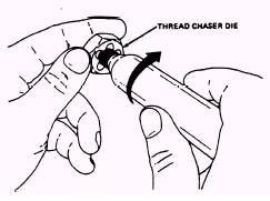 Figure 6-23.-Cleaning threads. within the valve body. Any cylinder found with less than seven full threads must be discarded. CAUTION STEEL THREADS ON CARBON DIOX-IDE CYLINDERS CAN CAUSE DAM-AGE TO ALUMINUM THREADS ON INFLATORS IF THE CYLINDER IS NOT CAREFULLY THREADED. IF BINDING OCCURS DURING THREAD- ING, REPLACE THE CYLINDER. After performing a functional test, insert a new seat seal gasket from a kit. At intermediate inspection intervals, inspect the condition of the gasket and replace it if necessary. Install the CO2 cylinder into the inflator as far as hand twisting will permit. Tighten the setscrews, if installed. NOTE: When you replace the CO2 cylinder to the inflator, ensure that the CO2 cylinder passes through the holding patch loop. Do not install the setscrews in LPA-2 and LPU-21/P life preservers. For all other life preservers, a missing setscrew does not warrant removal of the preserver from service until a replacement setscrew can be obtained. Safety-wire the inflator as required. Installation of Cylinders, LPU-23/P (Series) and LPU-24/P (Series) To install cylinders, proceed as follows: Weigh a charged CO2 compare the stamped minimum weight with the scale cylinder and CO2 cylinder.