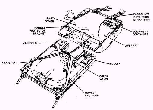 Figure 7-2.-RSSK-8 open. the emergency oxygen supply; the lower container, the life raft and survival equipment. The kit is opened by the yellow handle mounted on the forward right side. Two adjustable retaining straps, permanently mounted on the upper container, provide attachment of the kit to the aircrewman's torso harness. A flexible oxygen and communications hose installed on the aft left side of the upper container connects the aircrewman to the aircraft for communications and oxygen functions. In the event of a failure of the aircraft oxygen system, emergency oxygen is available by pulling the manual oxygen release on the kit. Oxygen from the kit then flows to the aircrewman through the emergency oxygen system reducer in the kit. A check valve in the oxygen line prevents emergency oxygen from flowing into the aircraft system or overboard from the kit. When the aircrewman ejects, the reducer is automatically operated by a lanyard connected between the actuator and aircraft. When he sits in the aircraft, the aircrewman connects the kit quick-release fittings to his retaining straps on his torso harness. He also connects his oxygen mask and communication hose to the seat pan quick-disconnect fitting. This hose can be quickly disconnected by pulling sharply on the hose assembly. The RSSK-8 is a part of the survival equipment used by aircrewman aboard the types of aircraft listed in table 7-1. As you can see,
