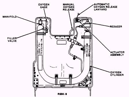 Figure 7-3.-Emergency oxygen schematic. these are high-performance aircraft that can operate at high altitudes. Therefore, in addition to containing survival gear, the kit also furnishes oxygen to the aviator when he ejects at altitudes where there is not enough oxygen to maintain consciousness. When the aircrewman ejects from the aircraft, the following events occur: The automatic actuation lanyard for the emergency oxygen system actuates the reducer assembly at seat ejection. The aircrewman is then supplied emergency oxygen for descent (fig. 7-3). If automatic actuation of the emergency oxygen system fails, the emergency oxygen system may be actuated by the aircrewman by means of the manual oxygen release (green ring). The radio beacon is automatically actuated by another actuation lanyard. The beacon provides a continuous signal during descent. When a safe altitude is reached, the aircrewman pulls the kit release handle free of the kit. This unlocks the containers and the lower half falls away but remains attached by the dropline assembly. The life raft, attached to the dropline, is automatically inflated. |
