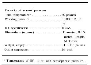 CO2 SUPPLY CYLINDERS Figure 8-2 illustrates the standard supply cylinder used universally in recharging various types of CO2 cylinders. A cutaway view of the cylinder valve is also shown. Table 8-1 lists some of the most pertinent data concerning supply cylinders. INSPECTING CO2 CYLINDERS AND RECHARGING Cylinders, including some of those of new manufacture, continue to bear ICC markings and, Table 8-1.-Specifications On Supply Cylinders